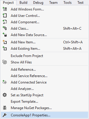Klicka på Project > ConsoleApp1 Properties... (eller motsvarande beroende på vad ert projekt heter).