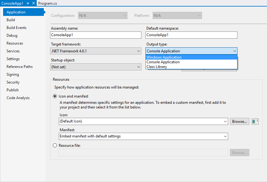 Ändra Output type till Windows Application.