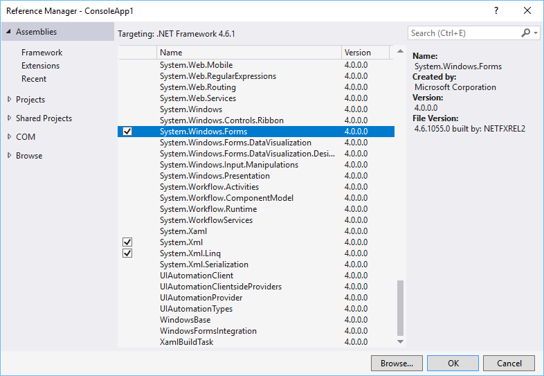 Kryssa i System.Windows.Forms och klicka på OK.