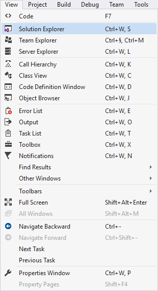 Om ni inte redan har fönstret Solution Explorer öppet, klicka på View > Solution Explorer.