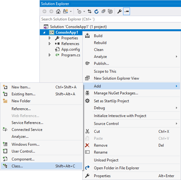 I Solution Explorer, högerklicka på ConsoleApp1 (eller motsvarande beroende på vad ert projekt heter) och klicka på Add > Class....