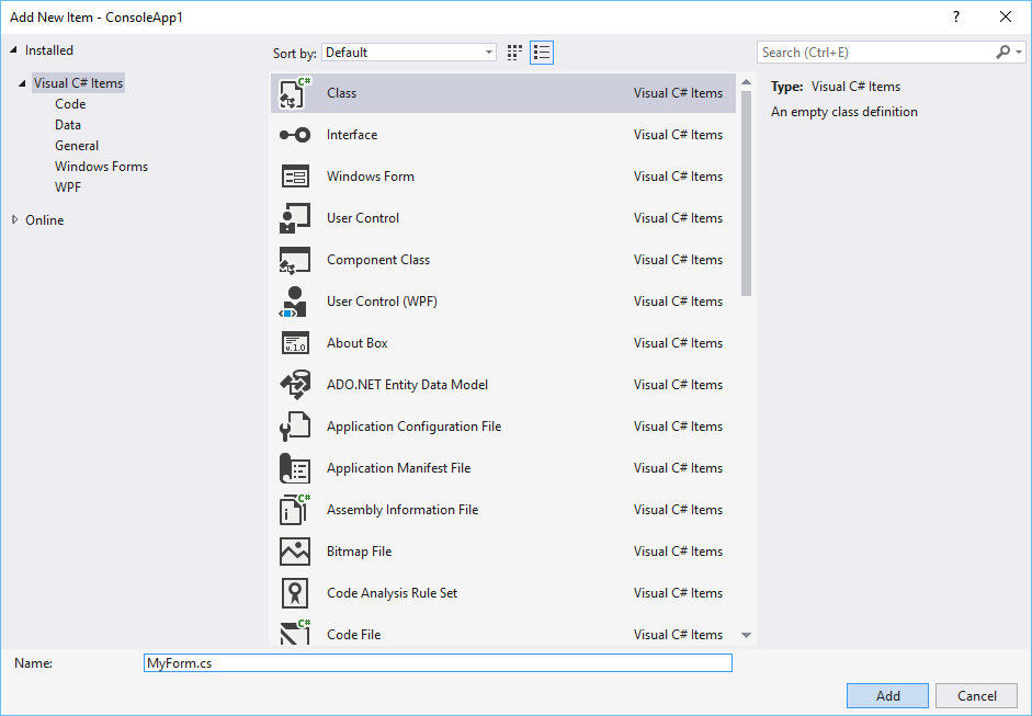 Skriv MyForm.cs i fältet Name och klicka på Add.