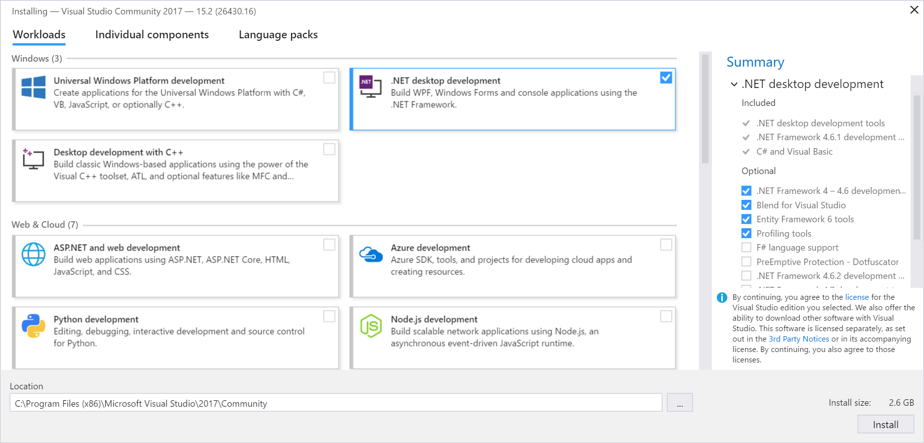 Starta det nedladdade installationsprogrammet och gå vidare tills du uppmanas välja komponenter. Kryssa då i .NET desktop development