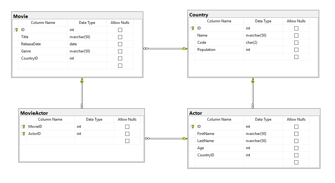 MovieID och ActorID i tabellen MovieActor utgör tillsammans primary key.Name i tabellen Country har ett unique constraint.Code i tabellen Country har ett unique constraint.Skriv sedan SELECT-kommandon som visar följande data: